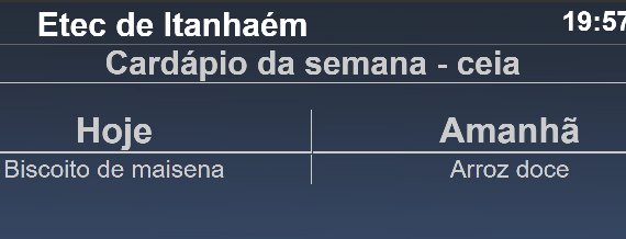 Agora além de informar sobre o uso dos laboratórios e eventos da Etec de Itanhaém, o monitor exibirá o cardápio do que será servido no refeitório da escola.